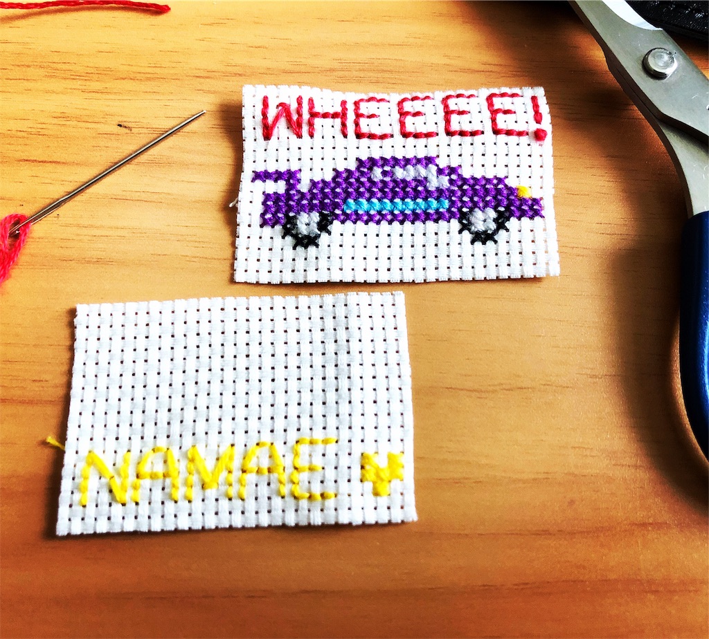 そして今回は、ちょっと縦に短いので上に文字を入れてみました👀これは、名前の部分と同じでバックステッチです。